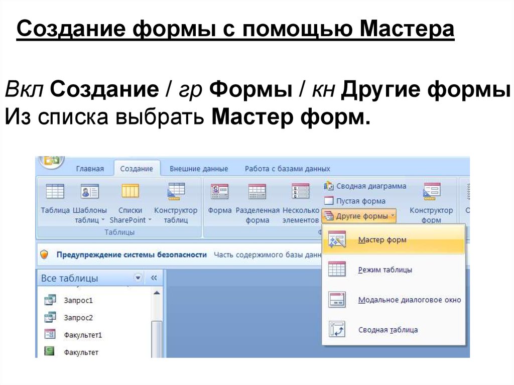 Создание формы с помощью МастераВкл Создание / гр Формы / кн Другие формы