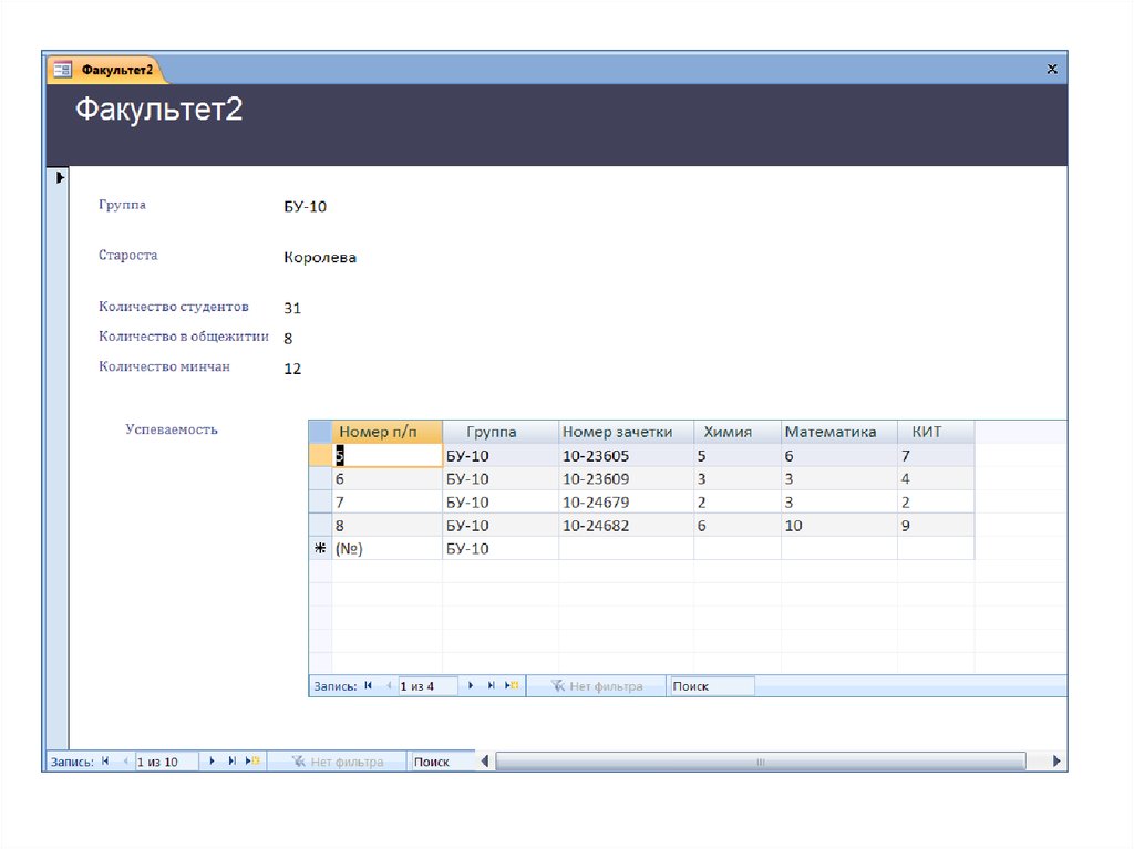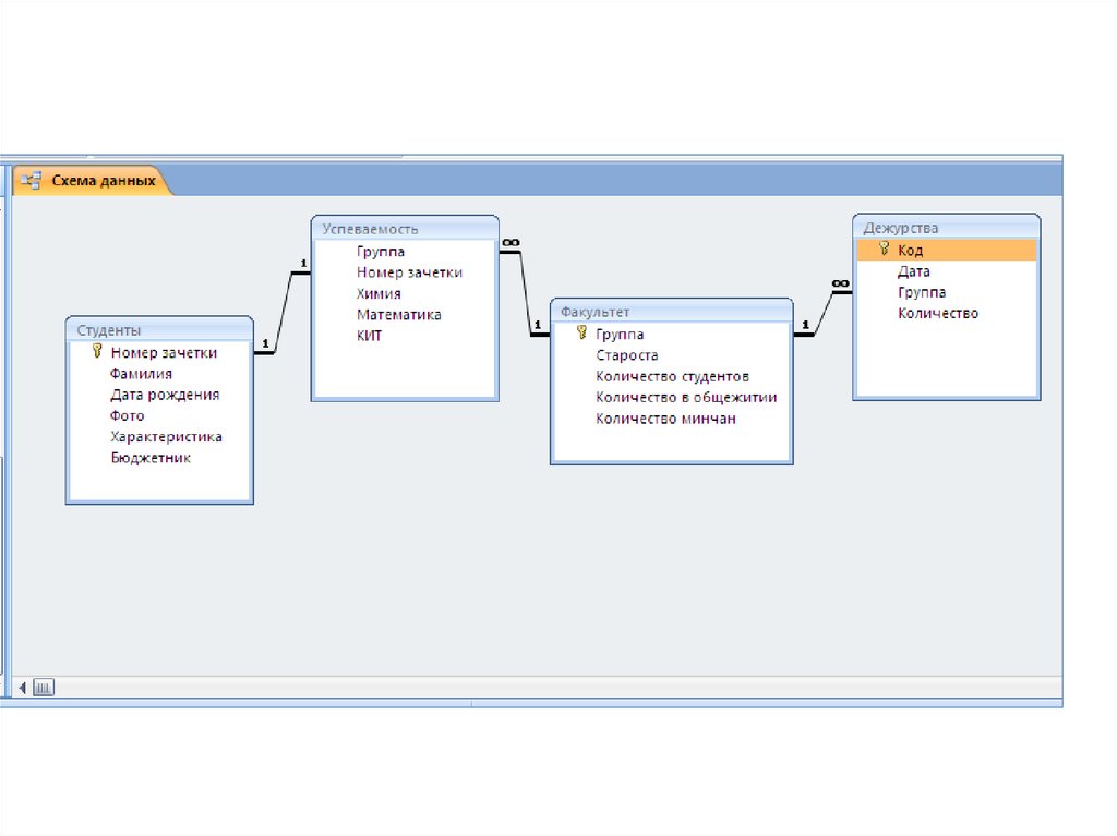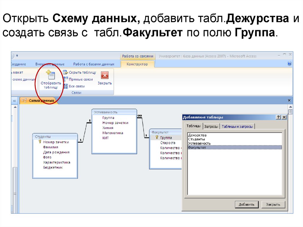 Открыть Схему данных, добавить табл.Дежурства исоздать связь с табл.Факультет по полю Группа.