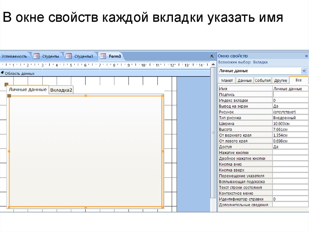В окне свойств каждой вкладки указать имя39.