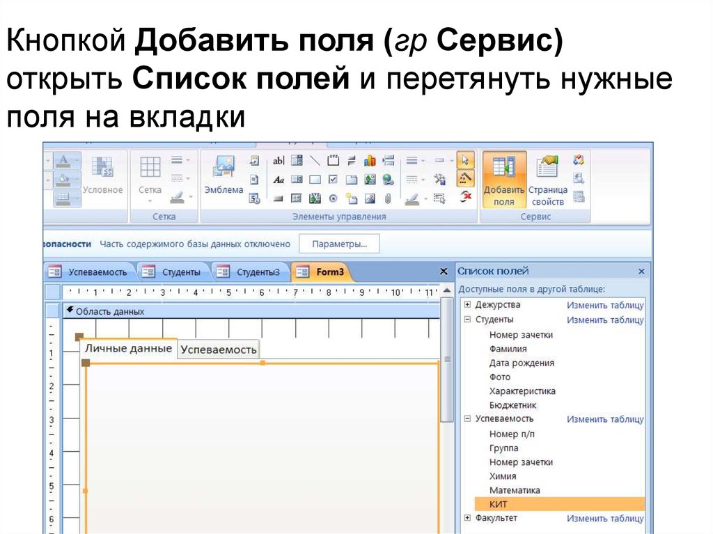 Кнопкой Добавить поля (гр Сервис)открыть Список полей и перетянуть нужные