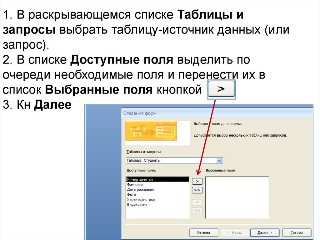 1. В раскрывающемся списке Таблицы изапросы выбрать таблицу-источник данных (или