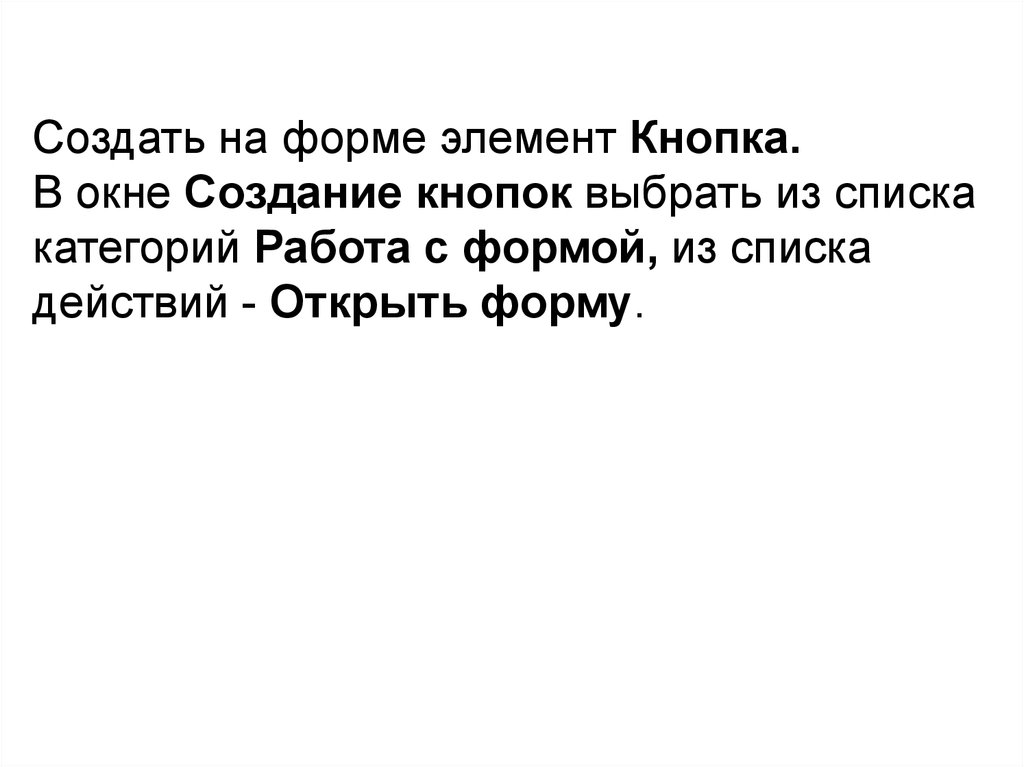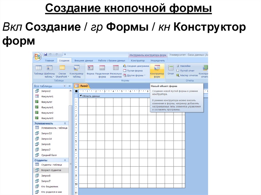 Создание кнопочной формыВкл Создание / гр Формы / кн Конструктор