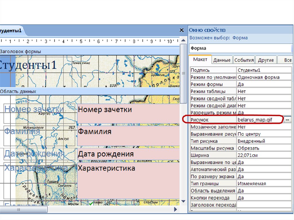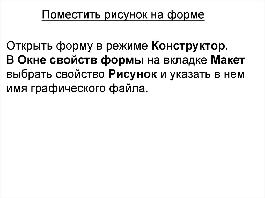 Поместить рисунок на формеОткрыть форму в режиме Конструктор.
