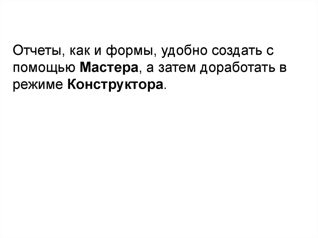 Отчеты, как и формы, удобно создать спомощью Мастера, а затем доработать в