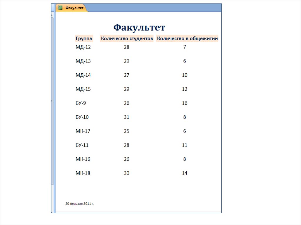 SELECT Факультет.Группа, Факультет.[Количество