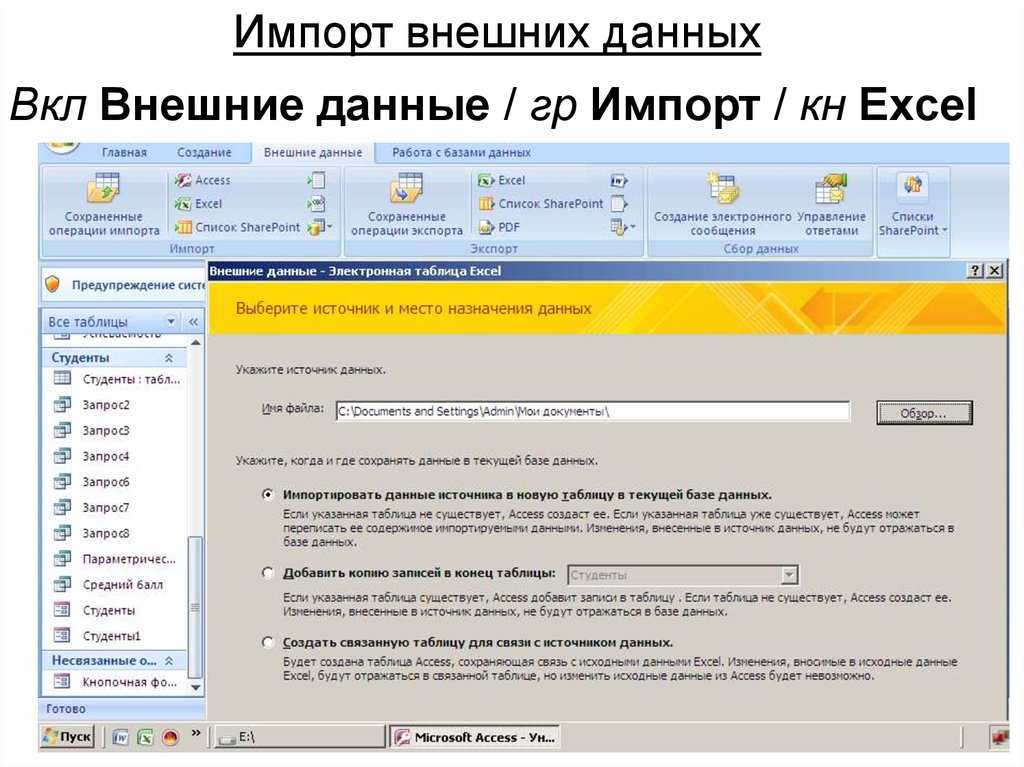 Импорт внешних данныхВкл Внешние данные / гр Импорт / кн Excel