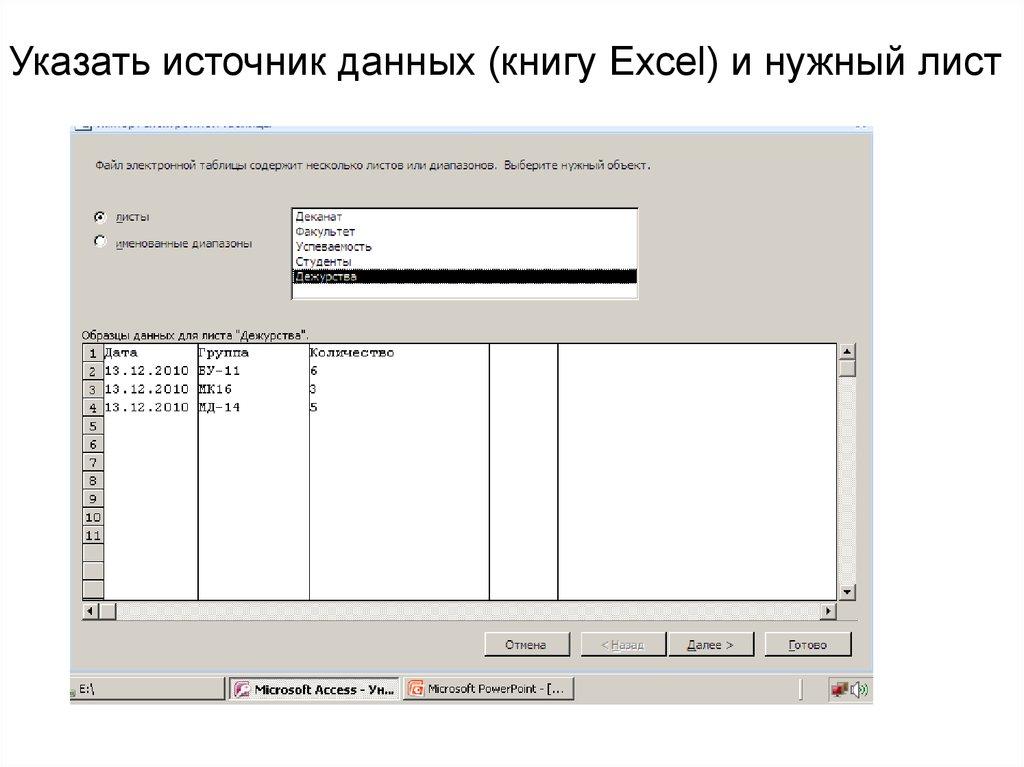 Указать источник данных (книгу Excel) и нужный лист63.