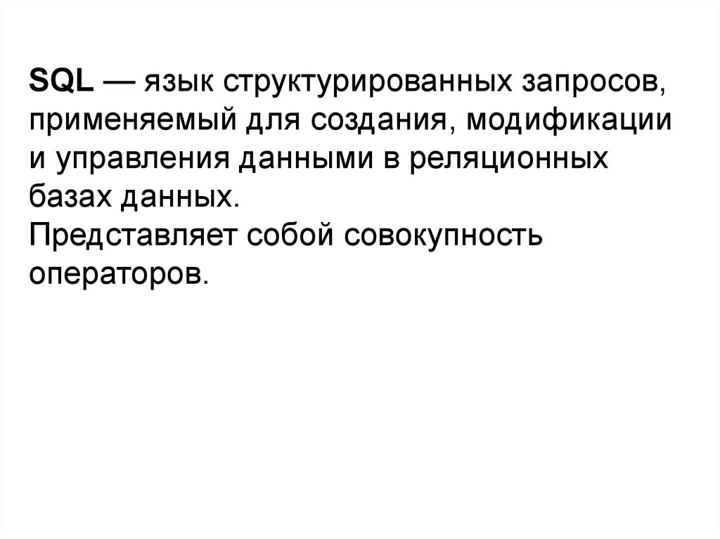 SQL — язык структурированных запросов,применяемый для создания, модификации