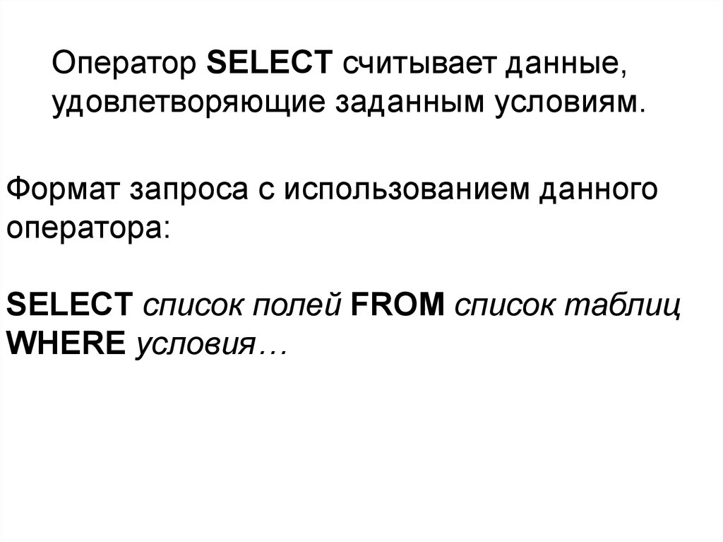 Оператор SELECT считывает данные,удовлетворяющие заданным условиям.