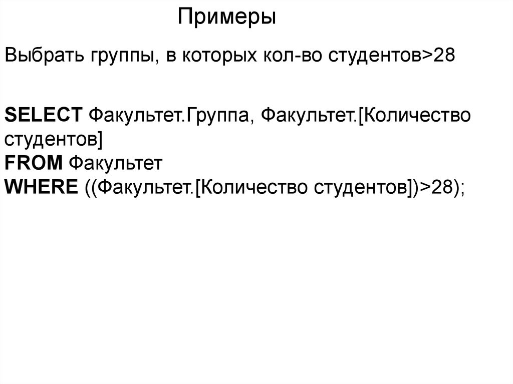 WHERE ((Факультет.[Количество студентов])>28);