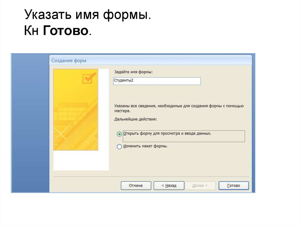 Указать имя формы.Кн Готово.