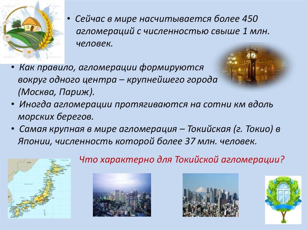 • Сейчас в мире насчитывается более 450агломераций с численностью свыше 1 млн.