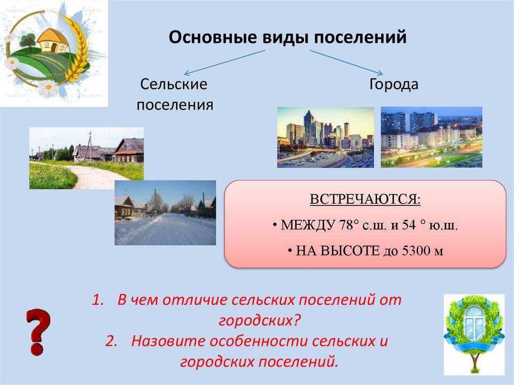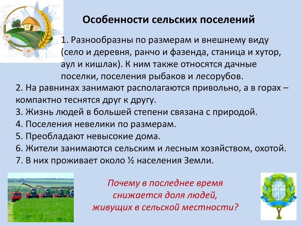 Особенности сельских поселений1. Разнообразны по размерам и внешнему виду