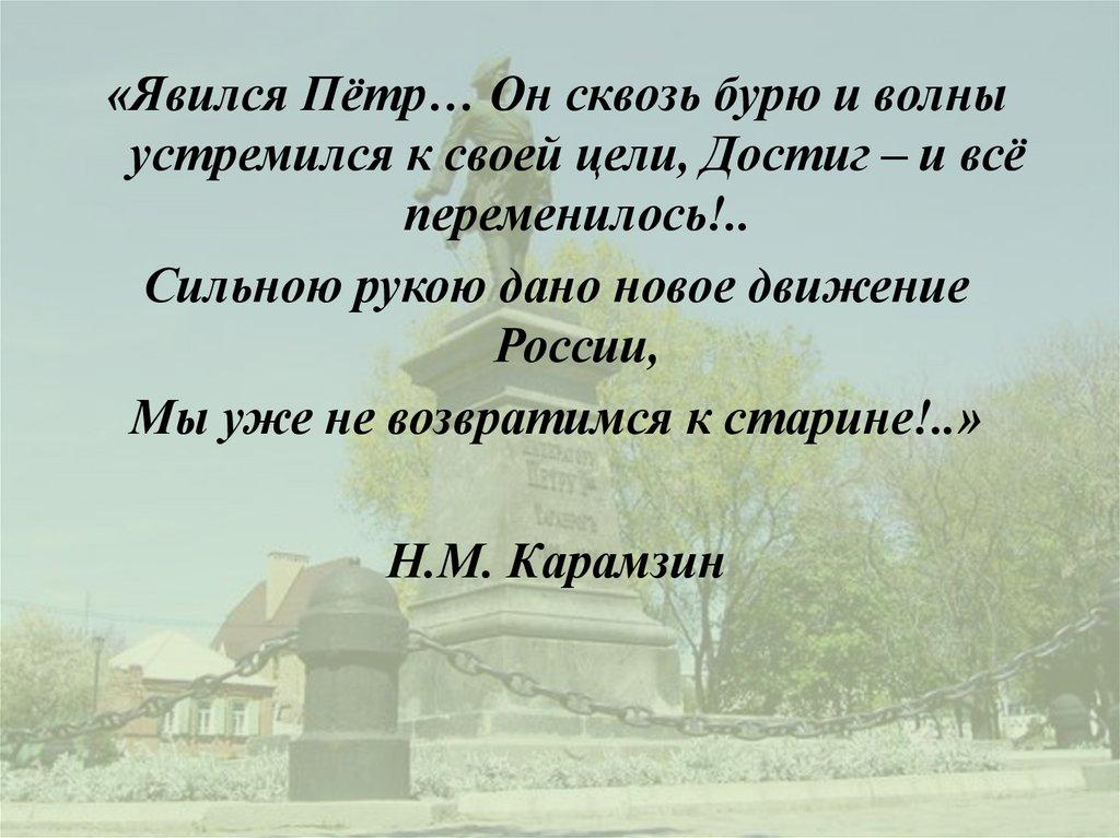 «Явился Пётр… Он сквозь бурю и волныустремился к своей цели, Достиг – и всё
