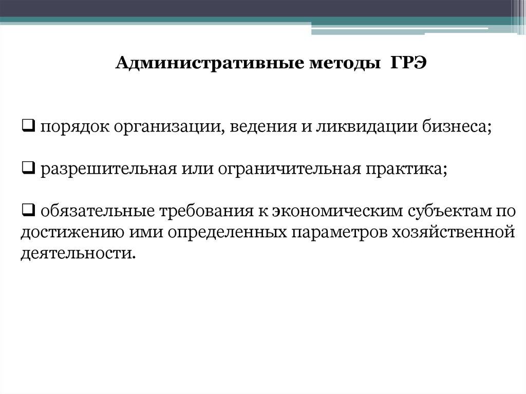 Административные методы ГРЭпорядок организации, ведения и ликвидации бизнеса;