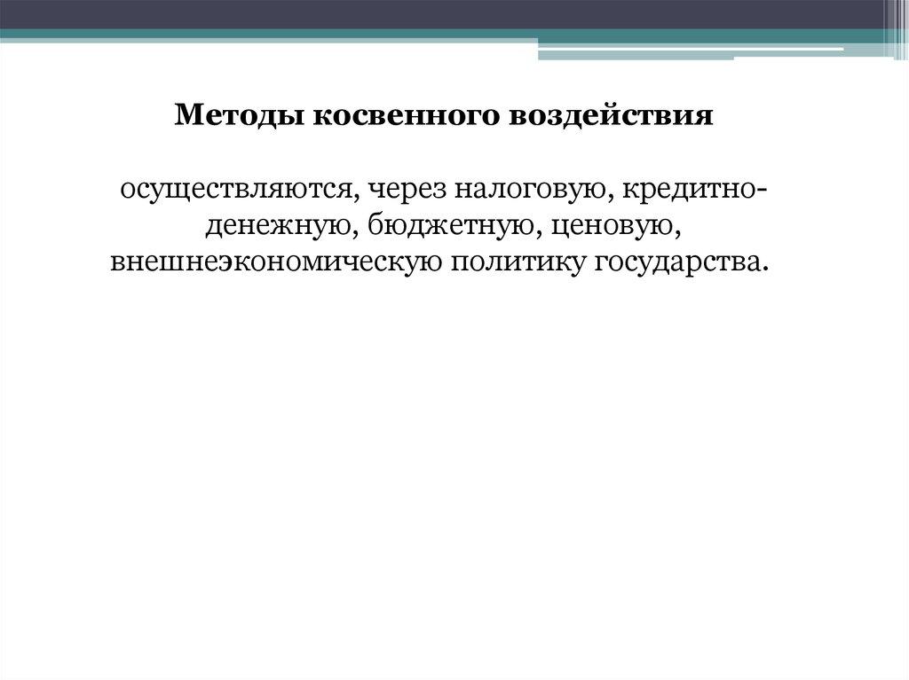 Методы косвенного воздействияосуществляются, через налоговую, кредитноденежную, бюджетную, ценовую,