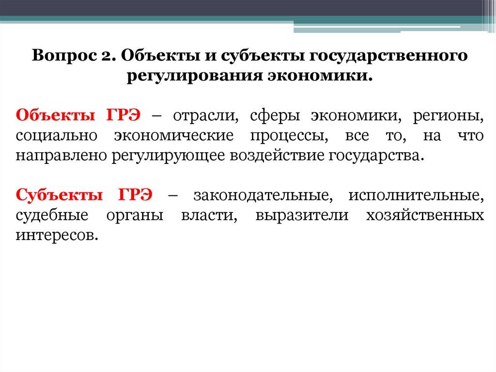 Вопрос 2. Объекты и субъекты государственногорегулирования экономики.