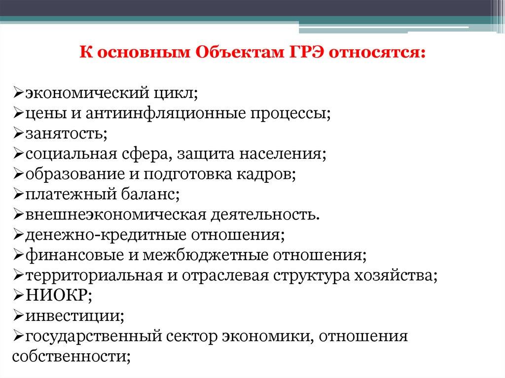 К основным Объектам ГРЭ относятся:экономический цикл;