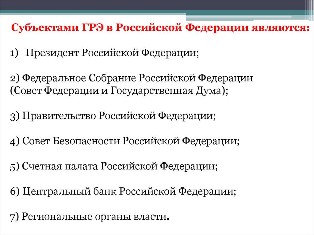 Субъектами ГРЭ в Российской Федерации являются:1) Президент Российской Федерации;