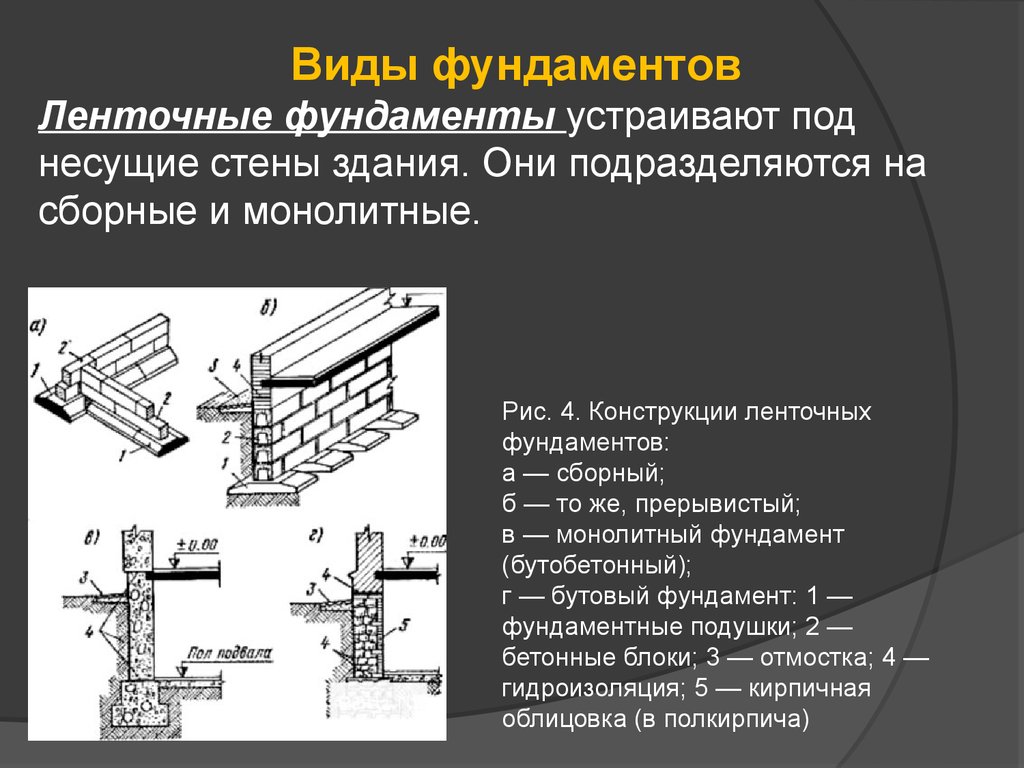 Рис. 5. Конструкции ленточных фундаментов: а — ленточный сборный