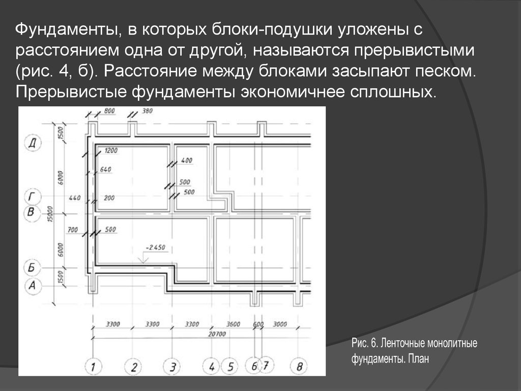 Фундаменты, в которых блоки-подушки уложены срасстоянием одна от другой, называются прерывистыми
