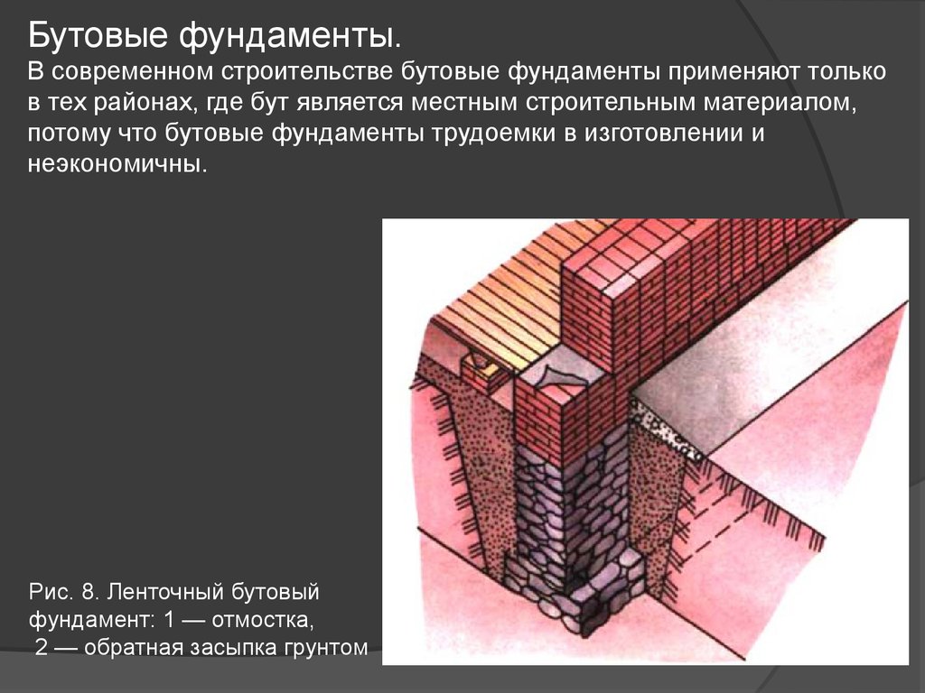 Бутовые фундаменты.В современном строительстве бутовые фундаменты применяют только