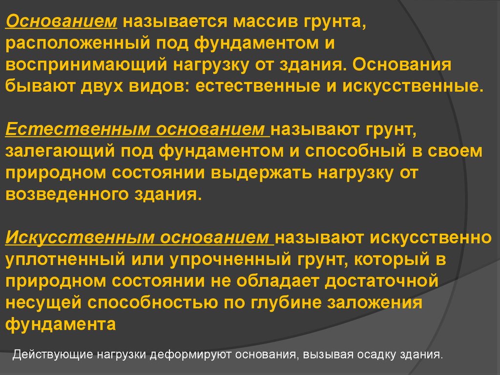 воспринимающий нагрузку от здания. Основания