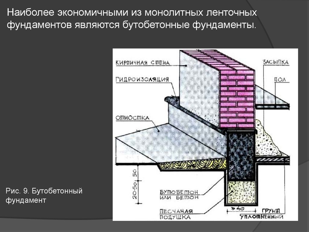 Наиболее экономичными из монолитных ленточныхфундаментов являются бутобетонные фундаменты.