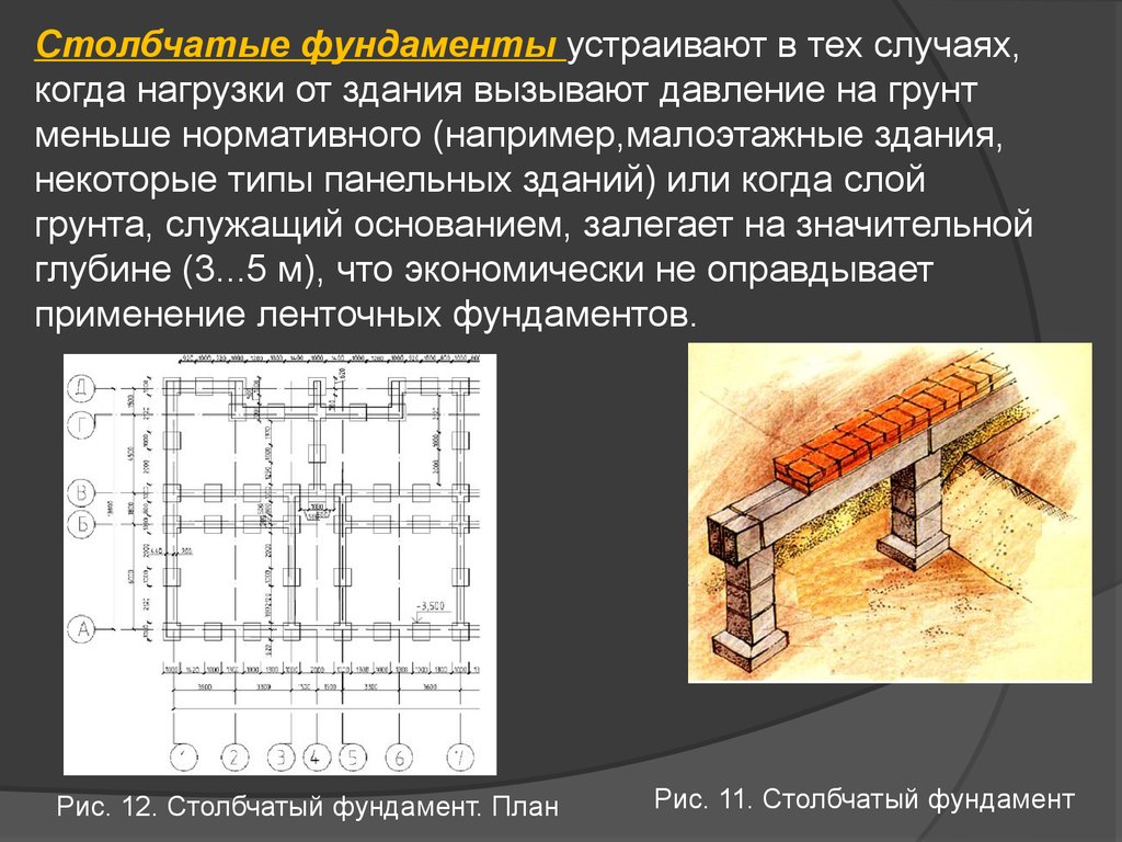 Столбчатые фундаменты устраивают в тех случаях,когда нагрузки от здания вызывают давление на грунт
