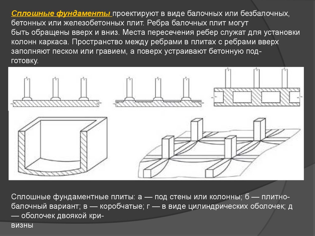 Сплошные фундаменты проектируют в виде балочных или безбалочных,бетонных или железобетонных плит. Ребра балочных плит могут