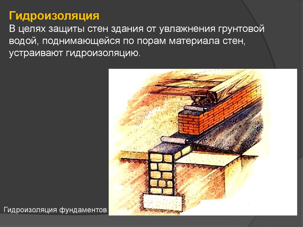 ГидроизоляцияВ целях защиты стен здания от увлажнения грунтовой