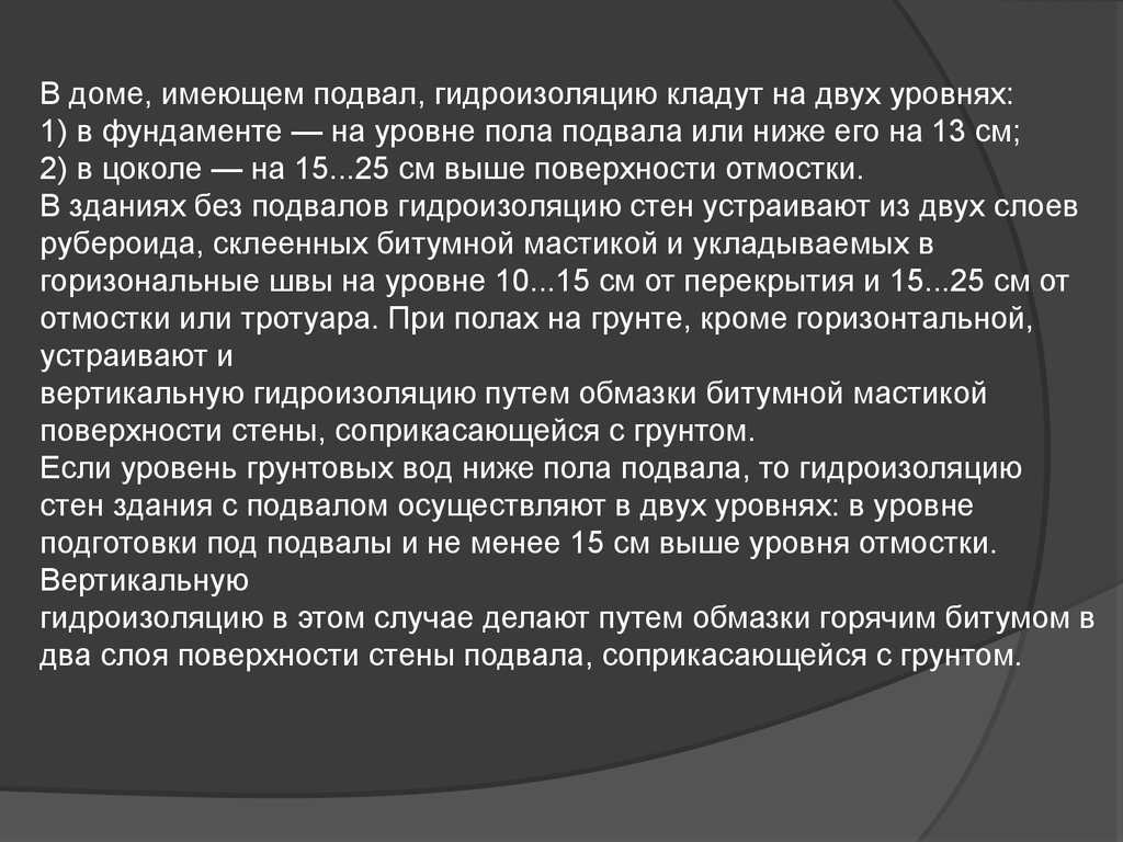 В доме, имеющем подвал, гидроизоляцию кладут на двух уровнях:1) в фундаменте — на уровне пола подвала или ниже его на 13 см;