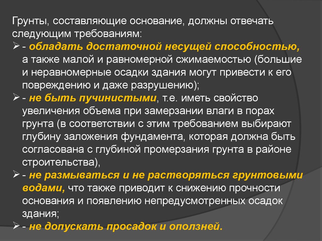 Грунты, составляющие основание, должны отвечатьследующим требованиям: