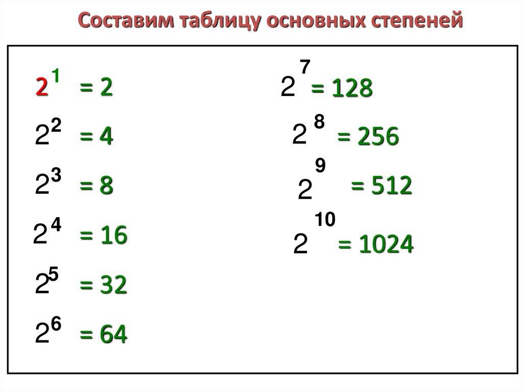 Составим таблицу основных степеней2