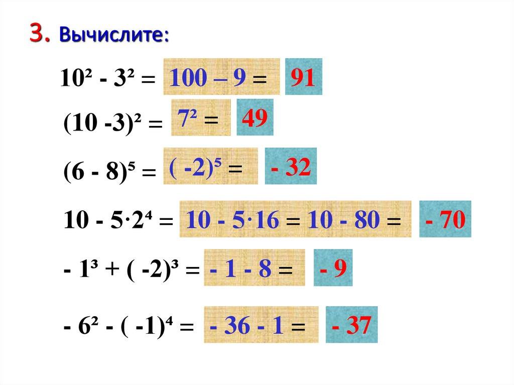 3. Вычислите:10² - 3² = 100 – 9 = 91