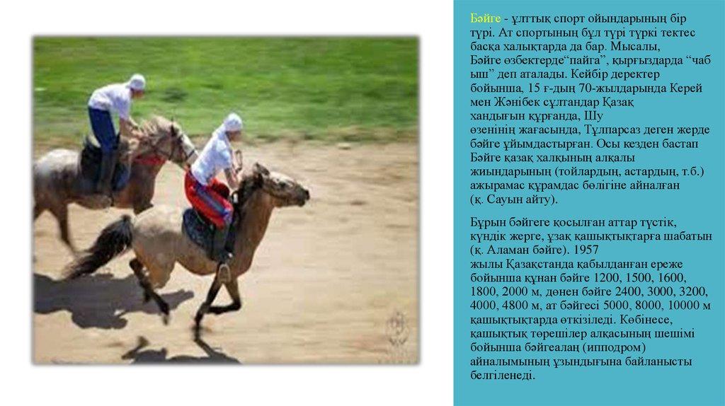 Бәйге - ұлттық спорт ойындарының біртүрі. Ат спортының бұл түрі түркі тектес