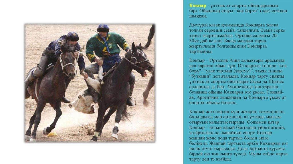 Көкпар - ұлттық ат спорты ойындарыныңбірі. Ойынның атауы “көк бөрте” (лақ) сөзінен