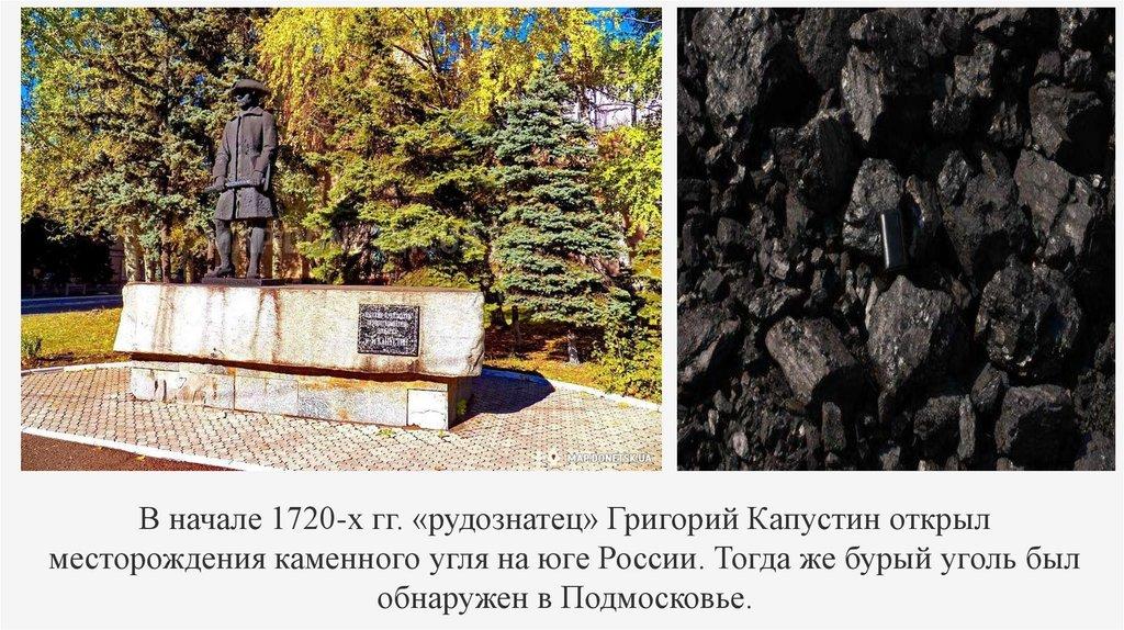 В начале 1720-х гг. «рудознатец» Григорий Капустин открылместорождения каменного угля на юге России. Тогда же бурый уголь был