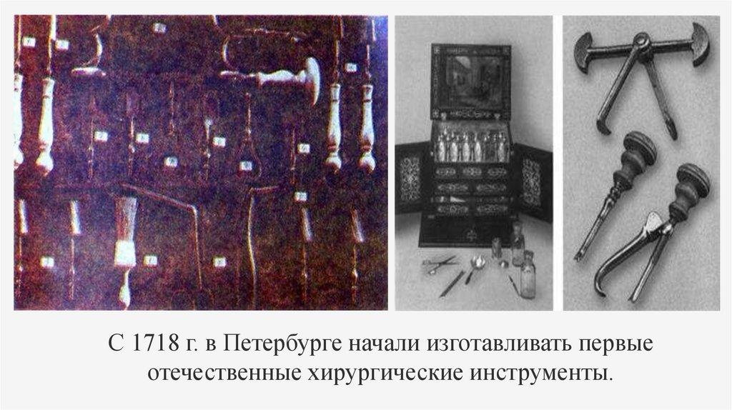 С 1718 г. в Петербурге начали изготавливать первыеотечественные хирургические инструменты.