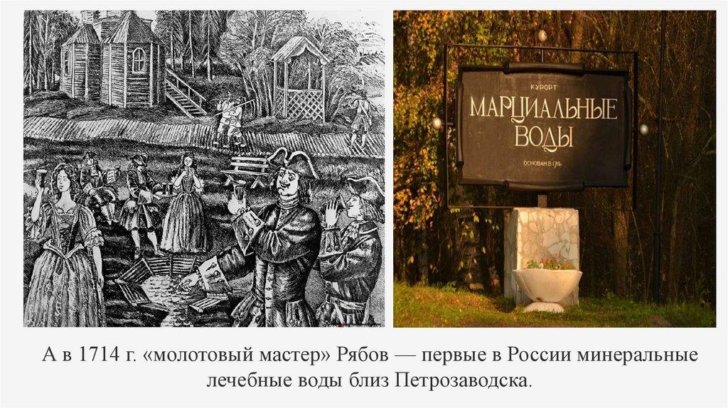 А в 1714 г. «молотовый мастер» Рябов — первые в России минеральныелечебные воды близ Петрозаводска.
