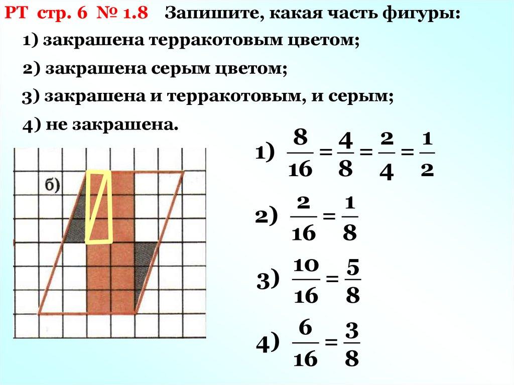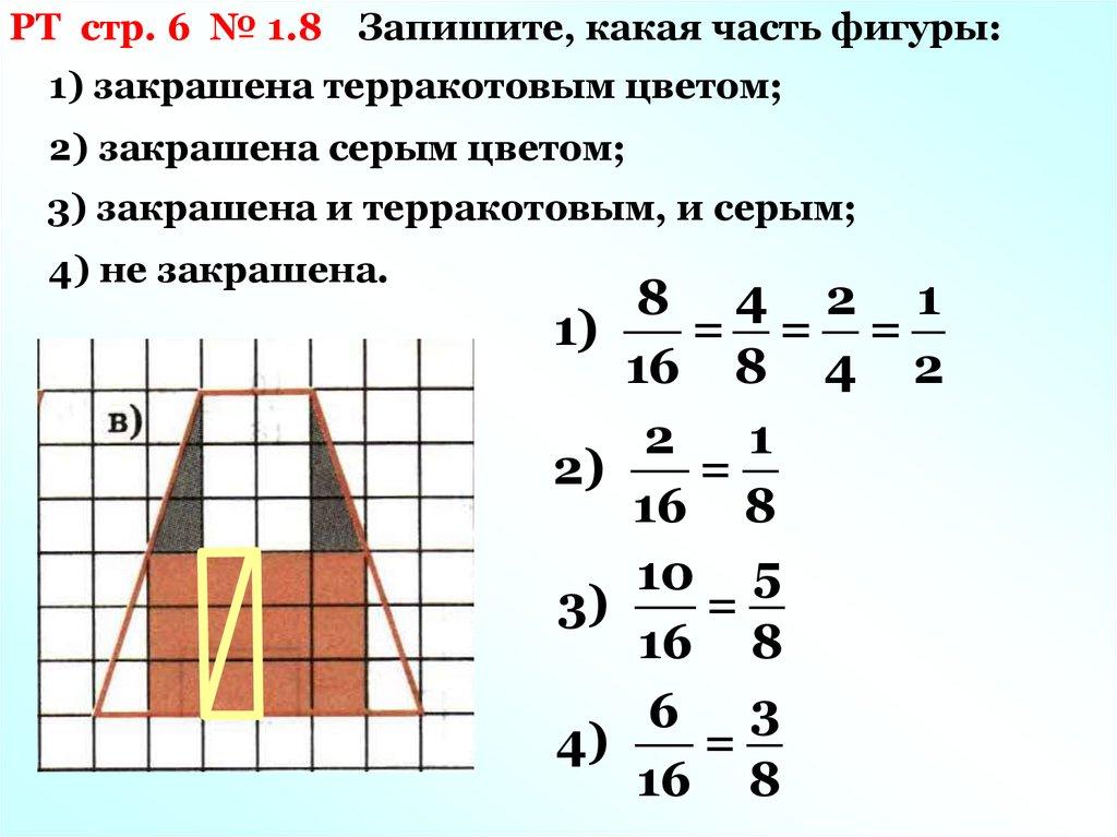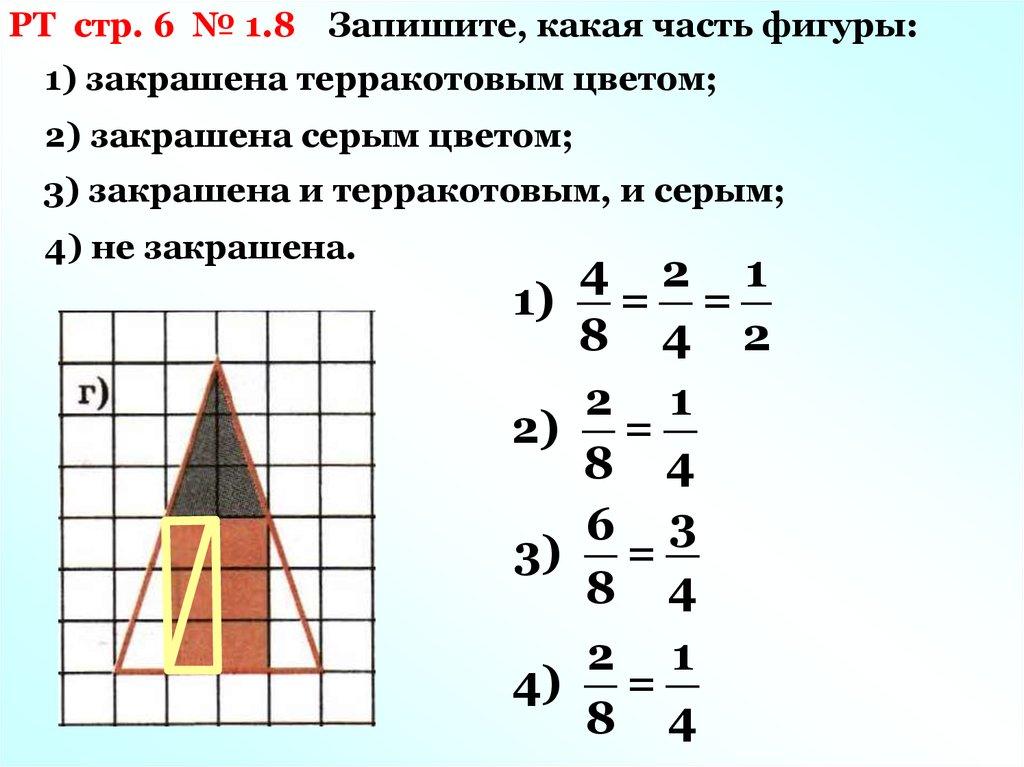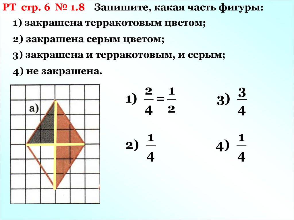 РТ стр. 6 № 1.8 Запишите, какая часть фигуры:1) закрашена терракотовым цветом;