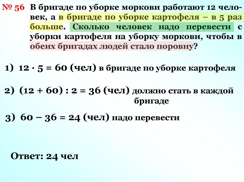 № 56 В бригаде по уборке моркови работают 12 человек, а в бригаде по уборке картофеля – в 5 разбольше. Сколько человек надо перевести с
