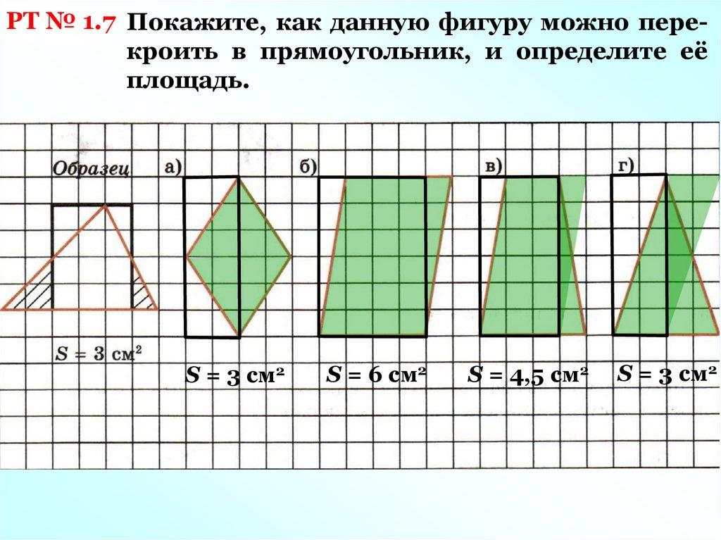 РТ № 1.7 Покажите, как данную фигуру можно перекроить в прямоугольник, и определите еёплощадь.