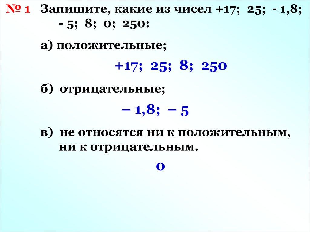 № 1 Запишите, какие из чисел +17; 25; - 1,8;- 5; 8; 0; 250: