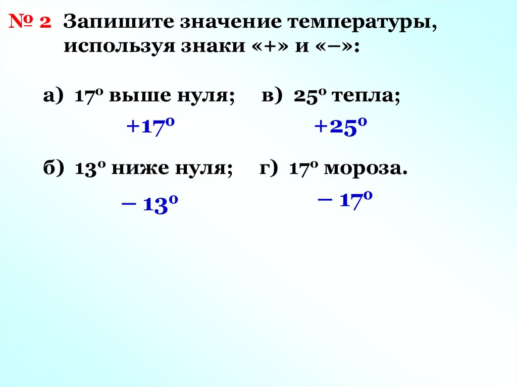 № 2 Запишите значение температуры,используя знаки «+» и «–»: