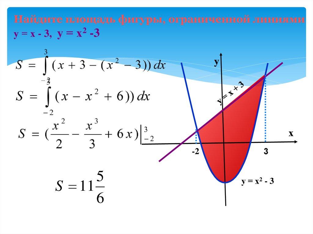 Найдите площадь фигуры, ограниченной линиямиу = х - 3, у = х2 -3