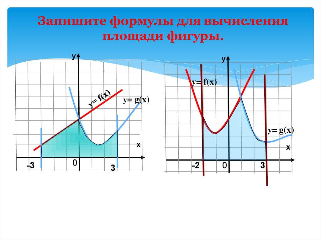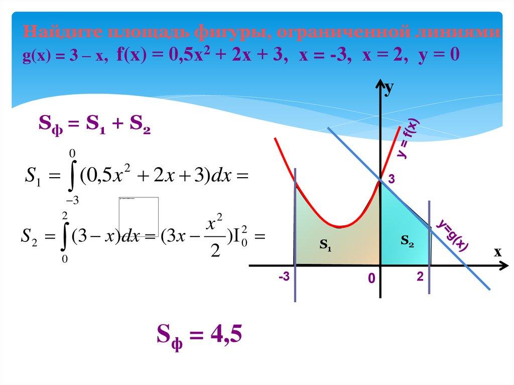 Найдите площадь фигуры, ограниченной линиямиg(x) = 3 – х, f(x) = 0,5х2 + 2х + 3, х = -3, х = 2, у = 0