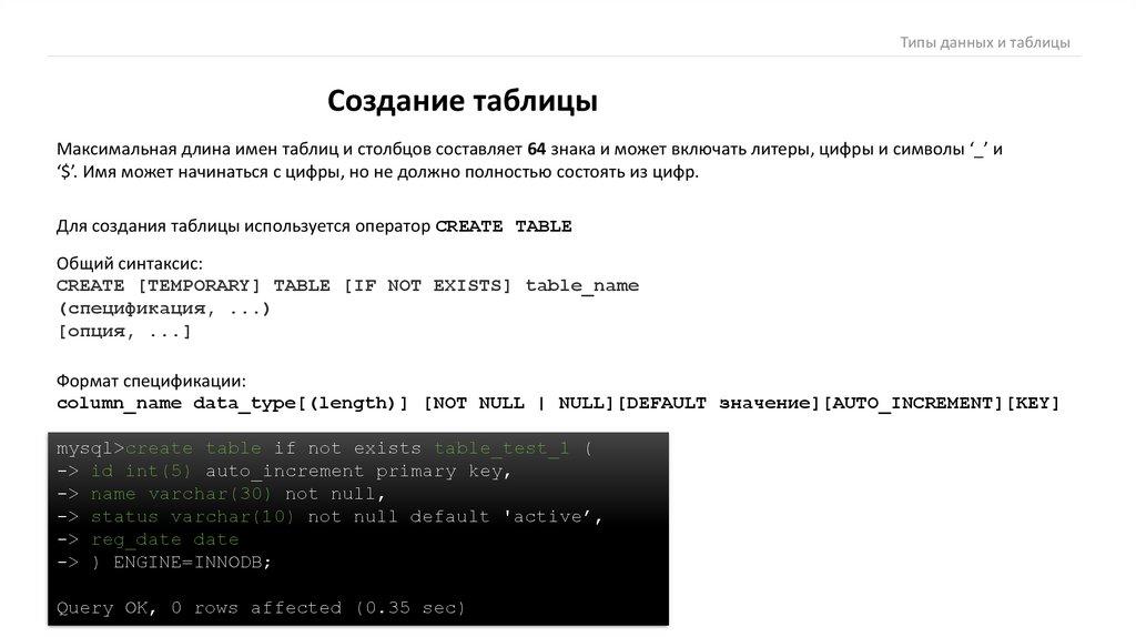 Максимальная длина имен таблиц и столбцов составляет 64 знака и может включать литеры, цифры и символы ‘_’ и