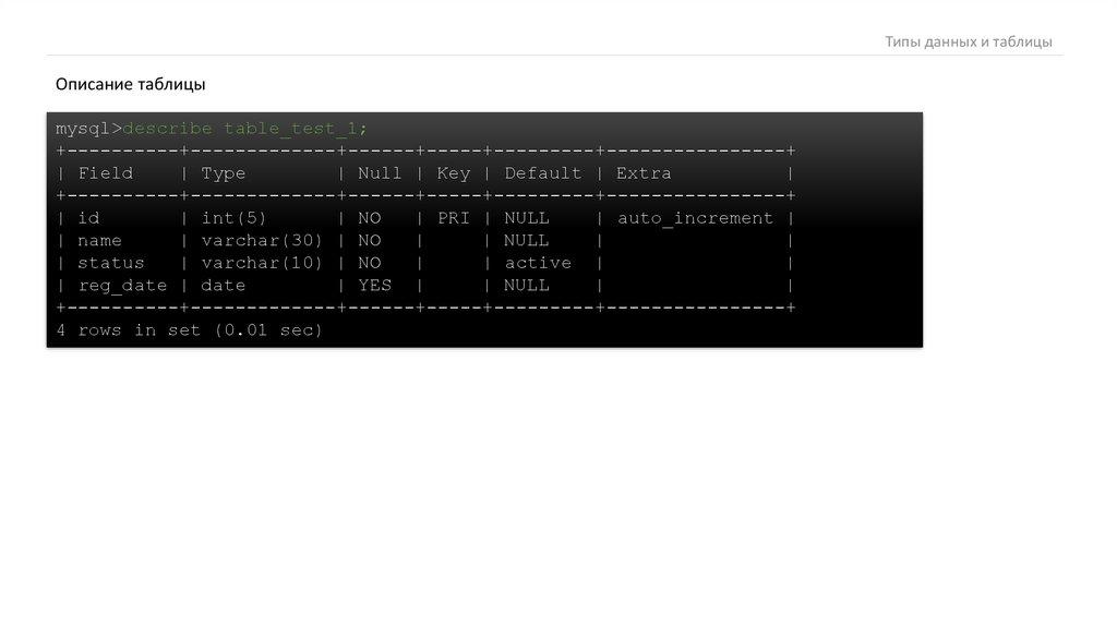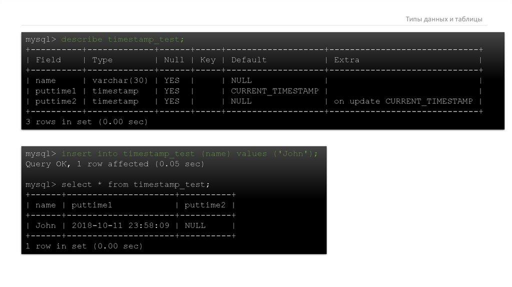Типы данных и таблицыmysql> describe timestamp_test;