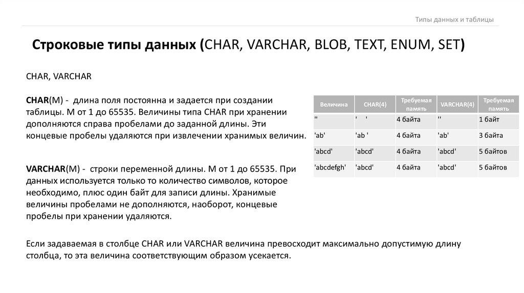 Строки этих типов принимают значения из заранее заданного списка допустимых значений. Основное различие